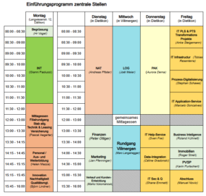 • Montag in Dällikon: Der Start in die Woche erfolgt mit der Begrüssung. Am Vormittag liegt der Fokus auf Support International, während am Nachmittag der Planzer Support Stab, Technik & Leasing, Versicherung, Personalwesen, Aus- und Weiterbildung, Innovation, Nachhaltigkeit und Qualitätsmanagement behandelt werden.